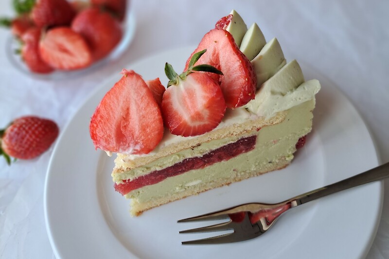 Einen 26er Tortenring innen mit Tortenrandfolie auslegen. Einen dünnen Teil des Biskuits einlegen und mit dem Erdbeersirup befeuchten. Den Ringrand mit Erdbeerhälften auslegen und 3/4 der Pistaziencreme lückenfrei einfüllen. Den Erdbeergelee auflegen und die restliche Pistaziencreme einfüllen. Zuletzt einen zweiten dünnen Biskuitboden bündig mit der Creme einlegen und ebenfalls mit dem Erdbeersirup befeuchten. Die Namaleka-Creme gleichmäßig aufstreichen und mit frischen Erdbeeren dekorieren.
