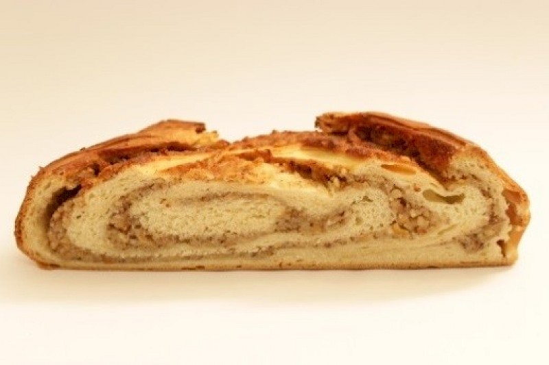 Je 1,000 kg Hefeteig ca. 40 x 50 cm ausrollen und mit 0,500 kg Nuss-Orangenfüllung bestreichen. Dabei an einer kurzen Seite ca. 4 cm frei lassen. Nun von der anderen kurzen Seite anfangen mit aufrollen, den Schluss sowie die Seiten unten andrücken und auf ein Backblech setzen. Den Strudel an der Oberfläche leicht mit Wasser einpinseln und mit Butterstreusel bedecken. Nach der Garzeit mittig einschneiden (ähnlich wie bei Weihnachtsstollen) und bei 200°C ca. 30-40 Minuten backen. Nach dem Auskühlen mit Puderzucker absieben oder mit Fondant bestreichen.