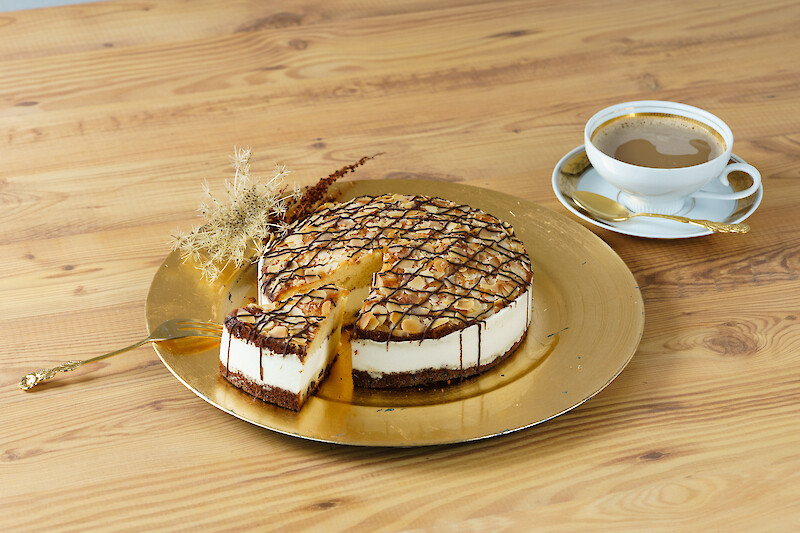 Den gut ausgekühlten Boden in der Mitte teilen und den unteren Teil in ein Schnittenblech einlegen. Die Eierlikörsahne einfüllen und den oberen Teil des Bodens auflegen, zuletzt mit etwas dunkler Kuvertüre abfädeln.